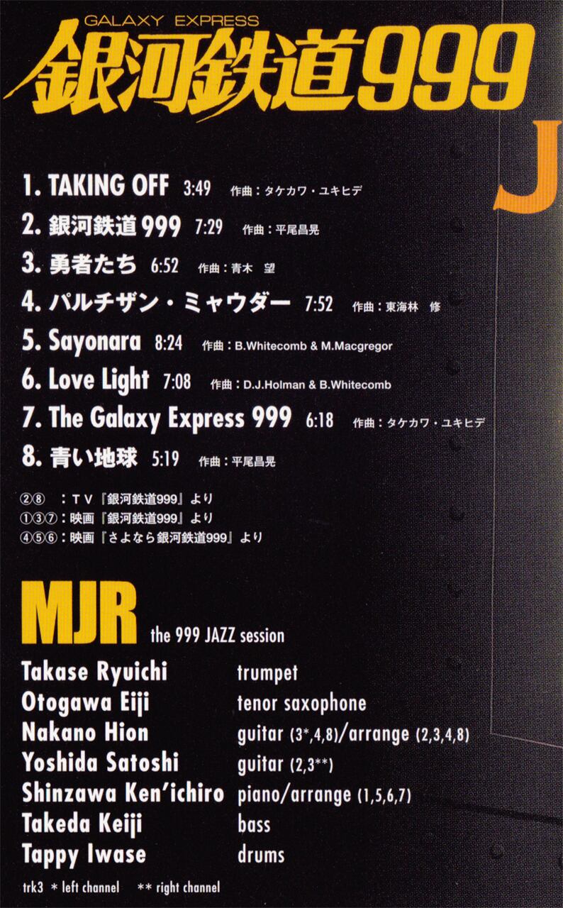 「銀河鉄道999」のテーマ曲、劇中曲をJazzアレンジでカバー。新澤健一郎はピアノと編曲で参加。ジャケットは松本零士氏の描き下ろしとのこと。